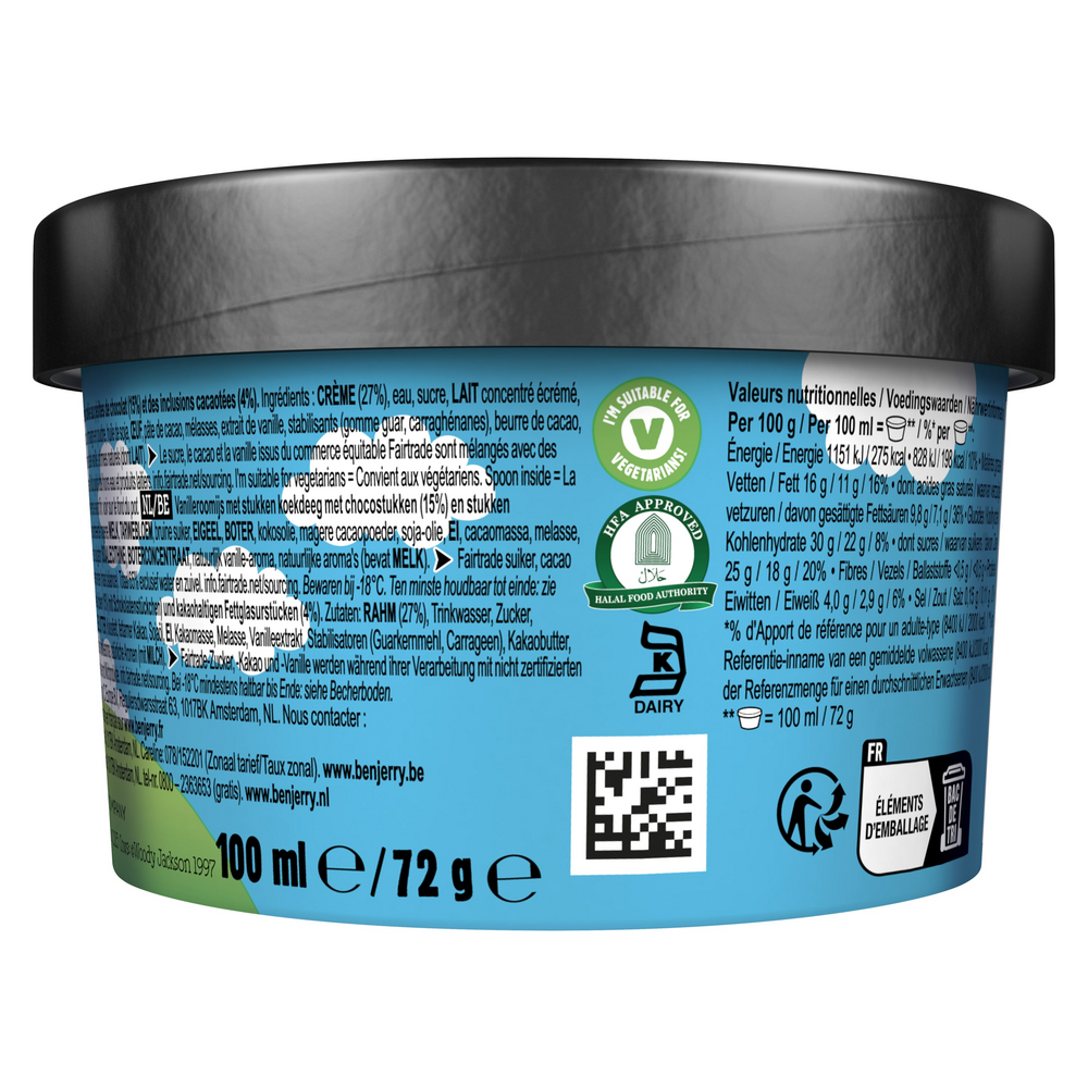 Sensatie van koekjesdeeg, romig vanille-ijs als basis, handige porties van 100 ml per cup, vertrouw op de kwaliteit van Ben & Jerry's.