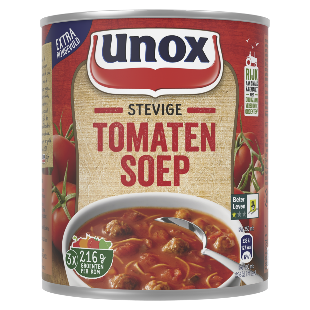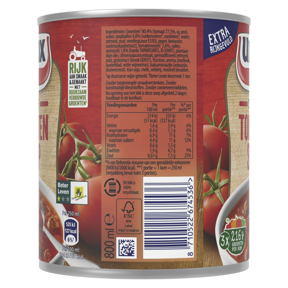 | Groenten¹ 80,4% (tomaat 77,5%, ui, prei), water, soepballen 4,8% (varkensvlees², rundvlees², water, zetmeel, zout, voedingszuur E330), peper, koriander, nootmuskaatextract), tomatenvezels¹ 2,6%, suiker, vermicelli 1,8% (harde TARWEGRIES, EI-EIWIT), plantaardige olie, citroensapconcentraat, gemodificeerd zetmeel, zout, gistextract (bevat GERST), fructose, aroma, knoflook, laurierblad, witte wijnextract, balsamicoazijn (wijnazijn, druivenmost). Kan soja, melk, selderij, mosterd bevatten. ¹op duurzame wijze geteeld. ²Beter Leven keurmerk 1 ster | |