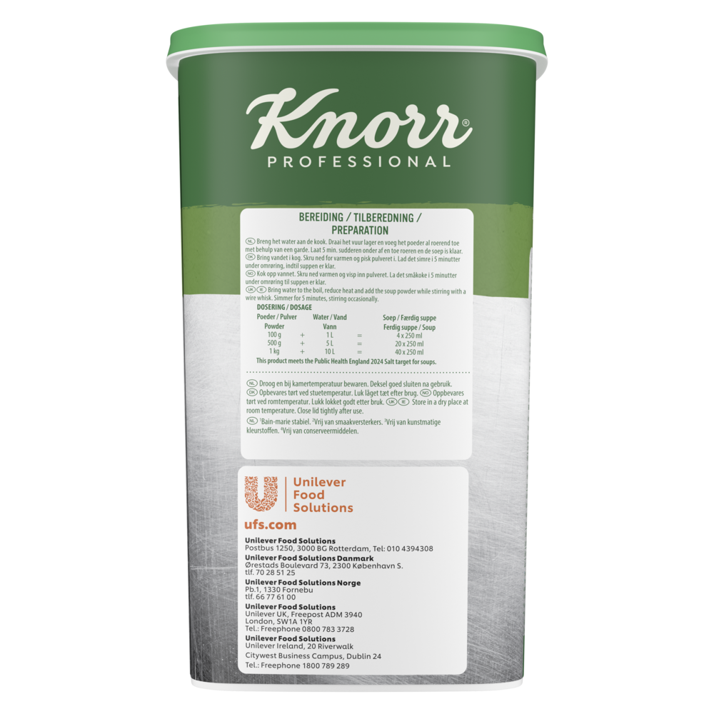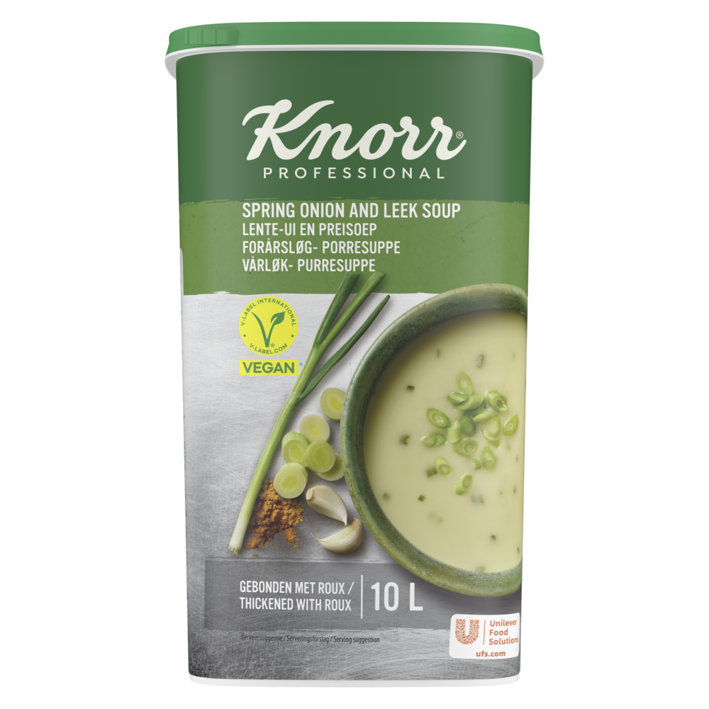 | Maltodextrine, aardappel- en erwtenzetmeel, zonnebloemolie, glucosestroop, roux (6%) (TARWEBLOEM, palmvet), zout, suiker, extra olijfolie verkregen bij de eerste persing, aardappel¹, ui¹ (2,7%), gistextract, prei¹ (2%), gemodificeerd maïszetmeel, palmvet, aroma's, lente-ui¹ (0,55%), knoflook¹ (0,2%), kurkuma, voedingszuur (citroenzuur). Kan ei, soja, melk, selderij en mosterd bevatten. ¹Duurzaam geteelde ingrediënten. | |